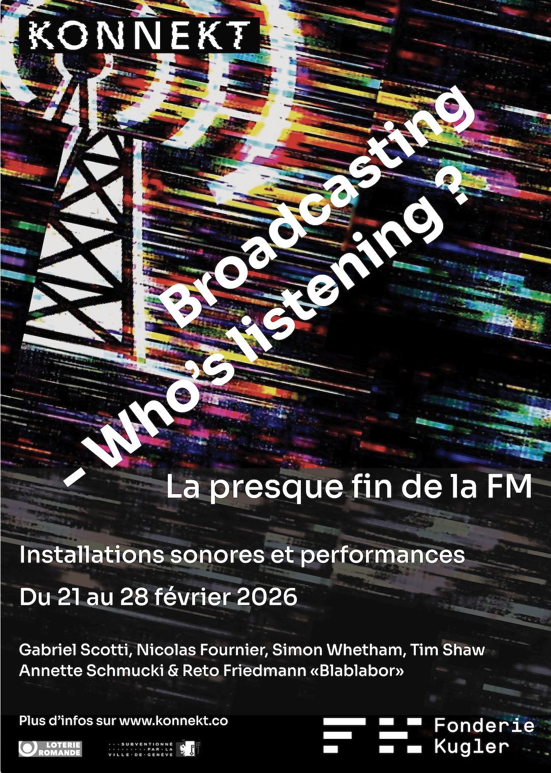 After switching off its FM transmitters on December 31, 2024, the SSR is facing a political reversal that extends FM broadcasting for private radio stations until at least 2026 and reopens—without a clear deadline—the question of a return of public service broadcasting to the FM band. This “end,” which ultimately turns out to be aborted, also marks the announced disappearance of a sonic universe made up of crackles, whistles, and noise—experiences inseparable from listening to and manipulating an analog radio receiver. On this occasion, Konnekt has brought together a series of artists exploring radio—both as a sound machine and as a medium—diverting, transforming, and “hacking” it through performances and sound installations, revealing the evocative power of a bygone era.