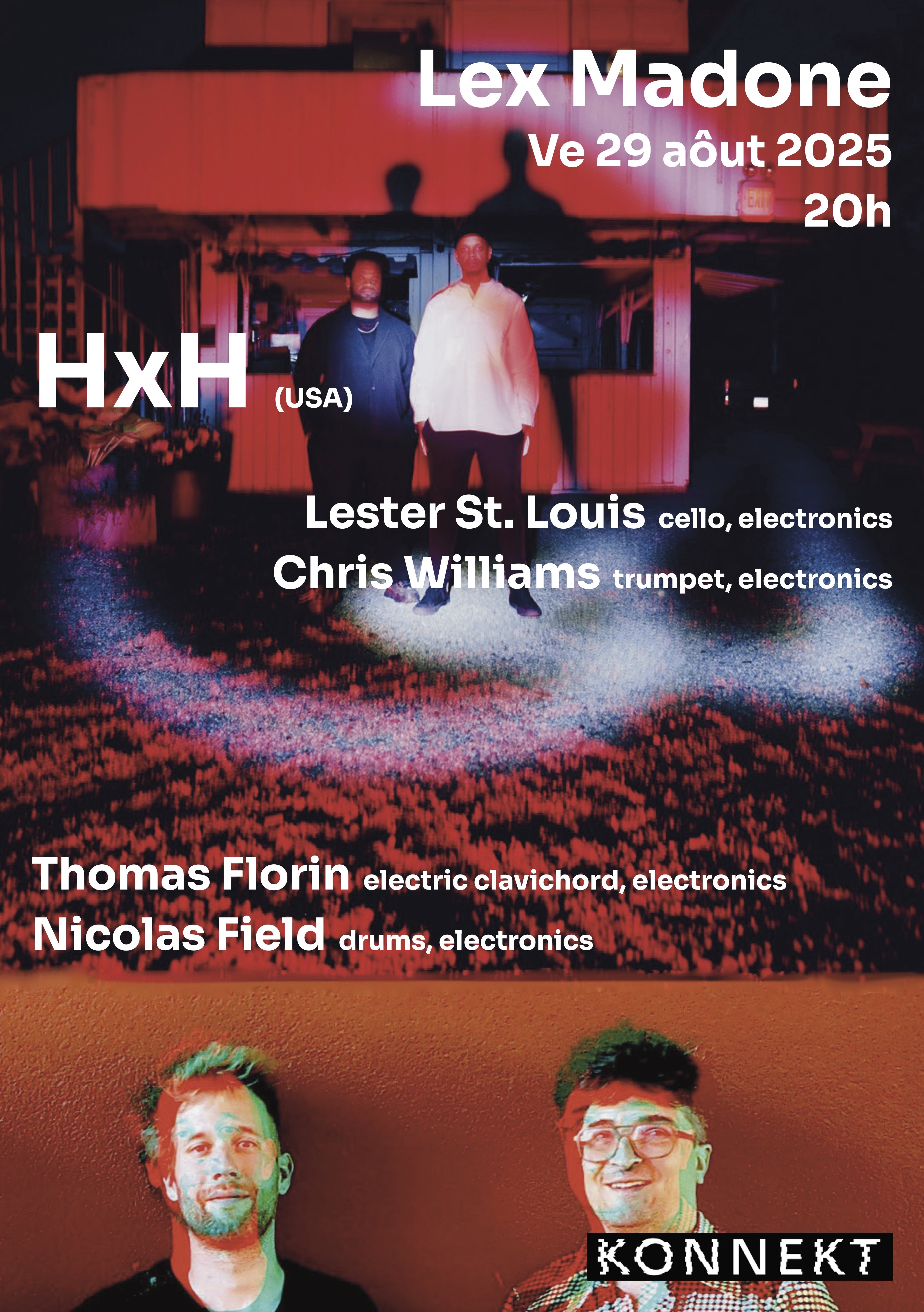 HxH explores a sound universe blending trumpet, cello and electronics, between grainy textures, expansive layers, breaks and rhythms. Their approach, developed through live performances, studio sessions and interdisciplinary collaborations, combines sonic expansion with sensitive intimacy. The duo strives to immerse the listener in a extended, real-time experience that can last from a few minutes to several hours.